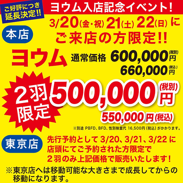 本店・東京店ともに各2羽ずつスペシャルプライスに♪